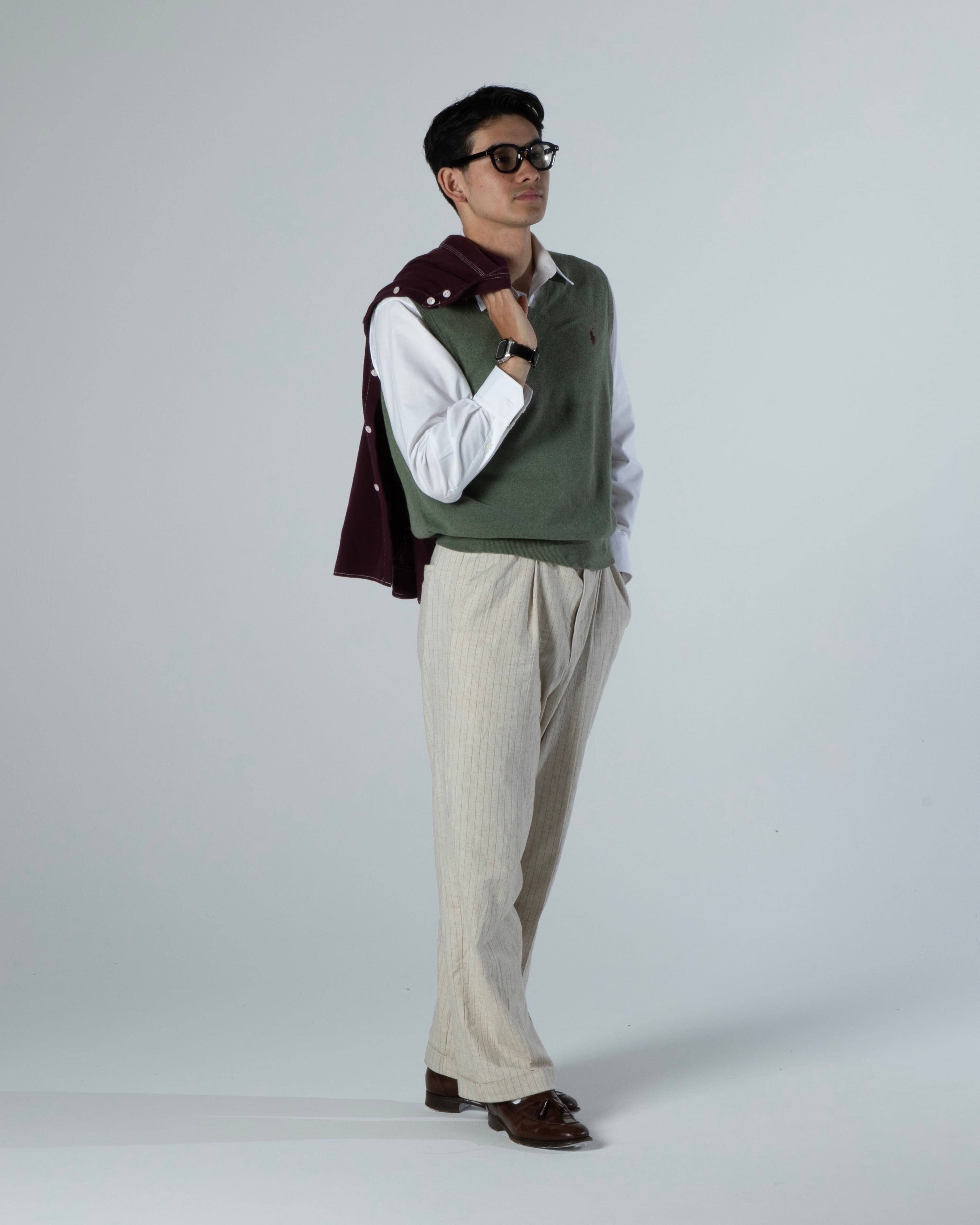 Linen Rayon-Striped Slacks/Ivory